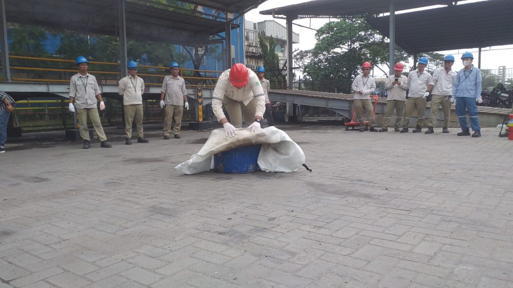 Praktek memdamkan api dengan “Fire Blanket”.